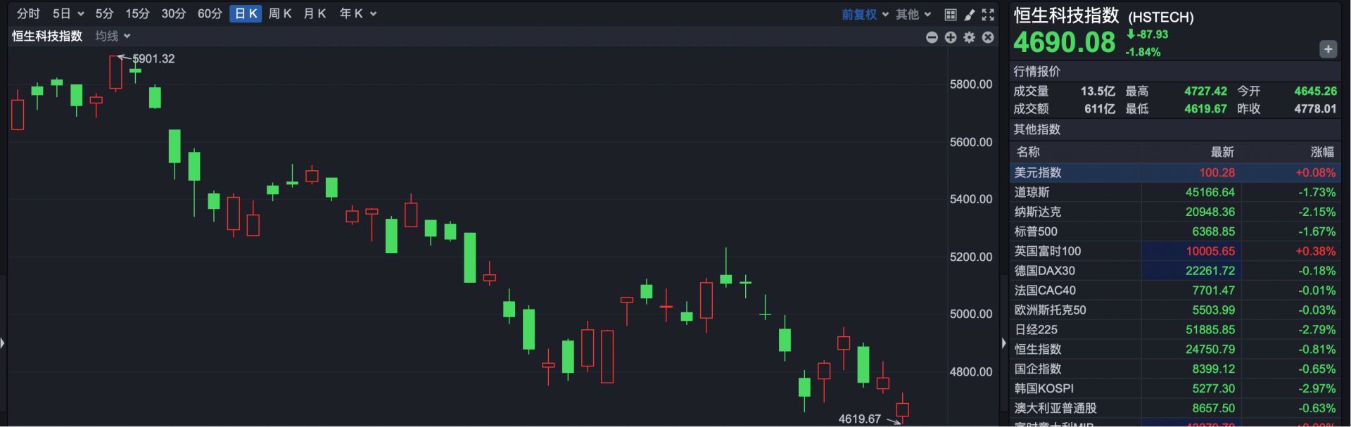 恒生科技指数收盘报4690.08点,下跌87.93点,跌幅1.84%。