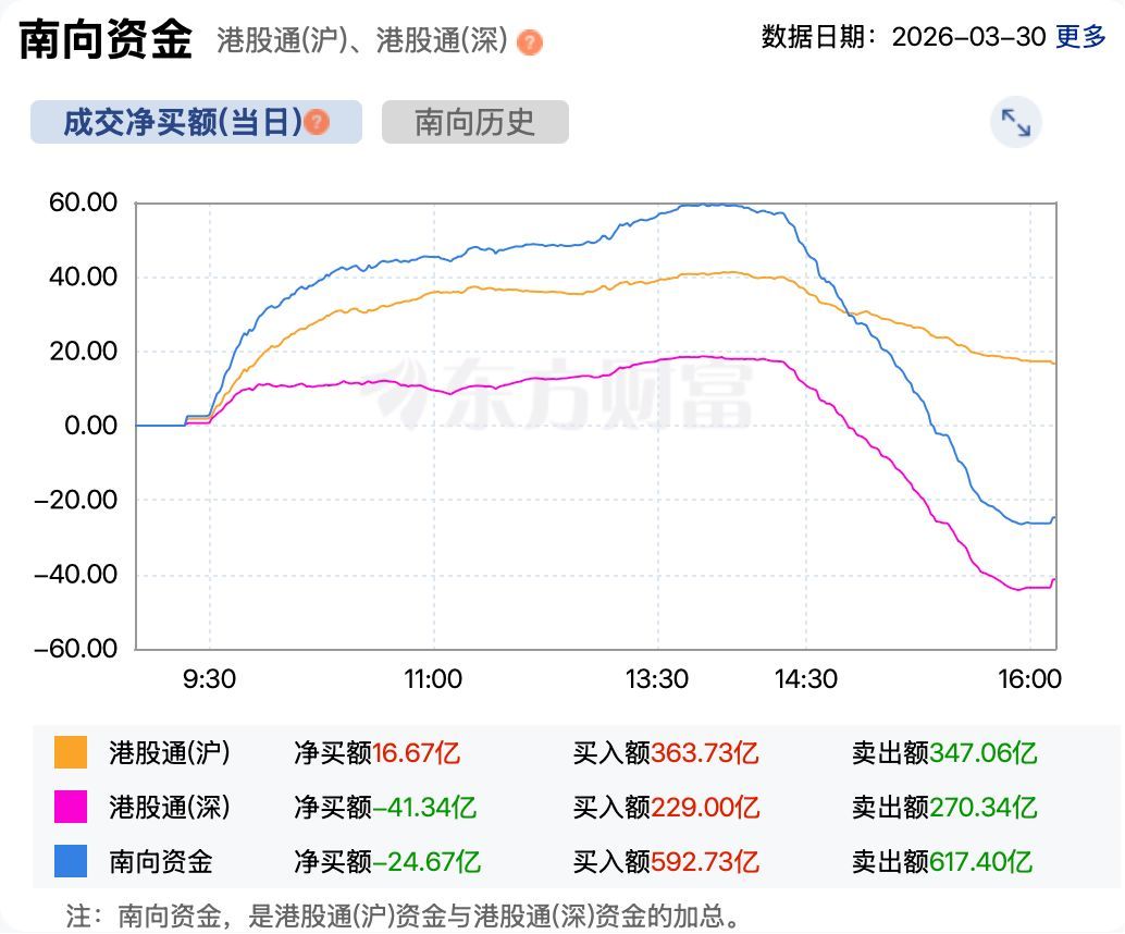 资金方面,南向资金今日略有流出。截至收盘,南向资金净卖出港股超24亿港元。