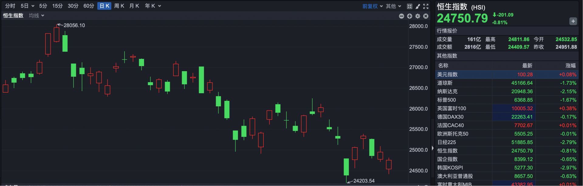 截至收盘,恒生指数报24750.79点,下跌201.09点,跌幅0.81%。