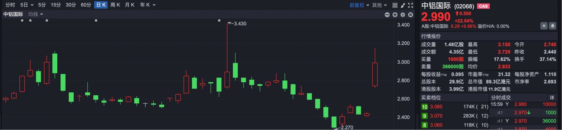 焦点板块方面,铝业股全天领涨市场。其中,中铝国际(HK02068)涨超22%,中国铝业(HK02600)涨超7%,中国宏桥(HK01378)涨超3%。